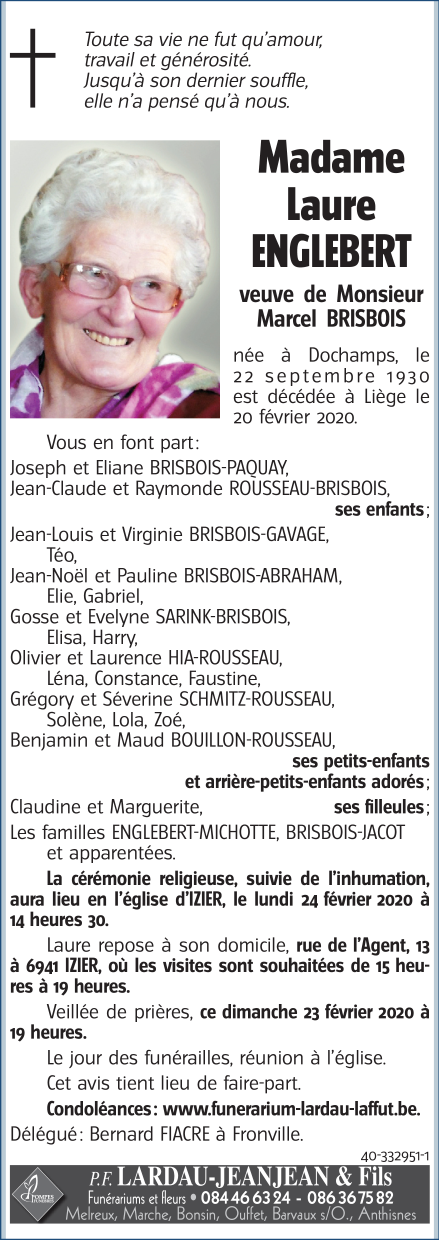 Décédée à Liège (4000) le jeudi 20 février 2020 à l'âge de 89 ans