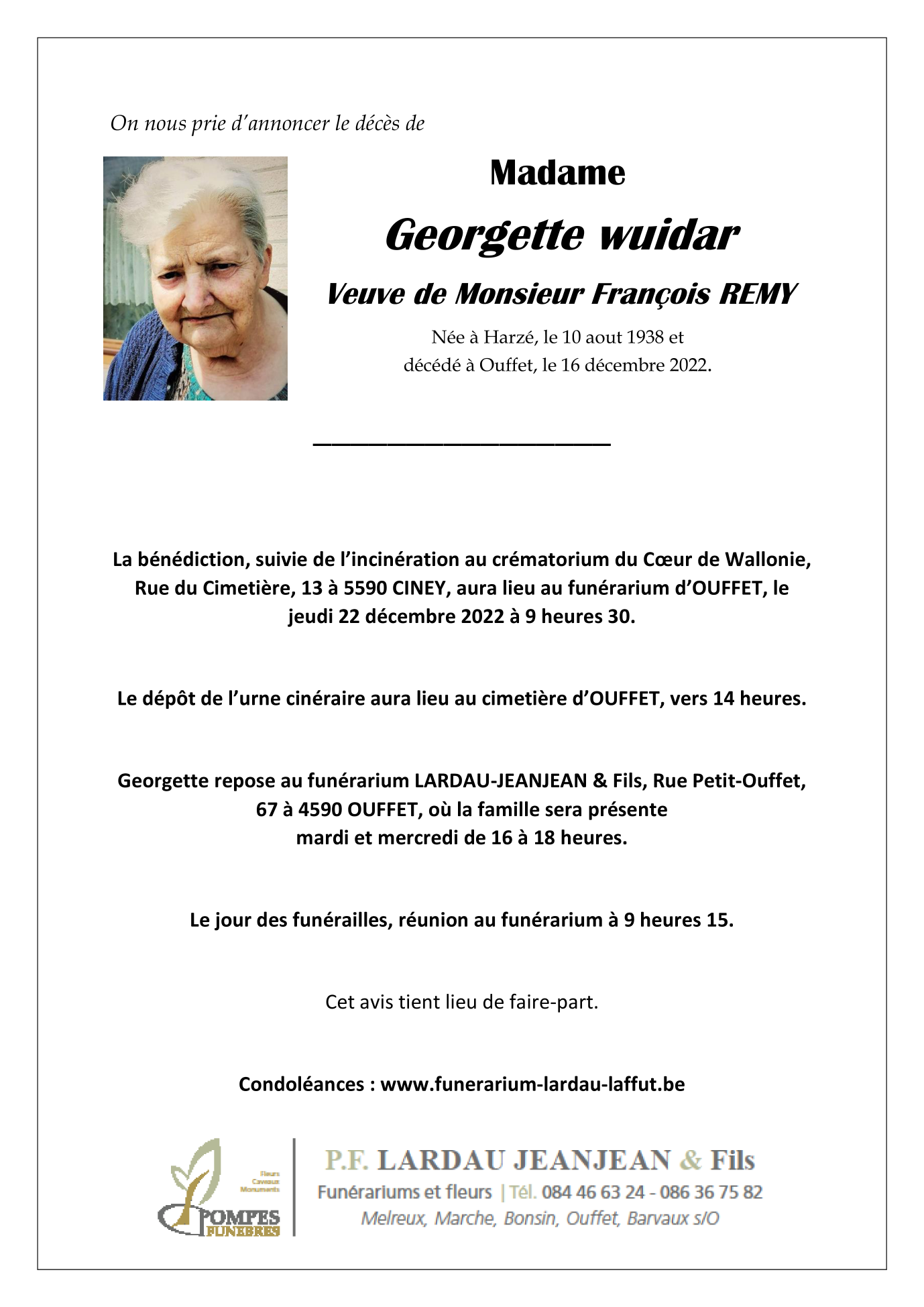 Décédée à Ouffet (4590) le vendredi 16 décembre 2022 à l'âge de 84 ans