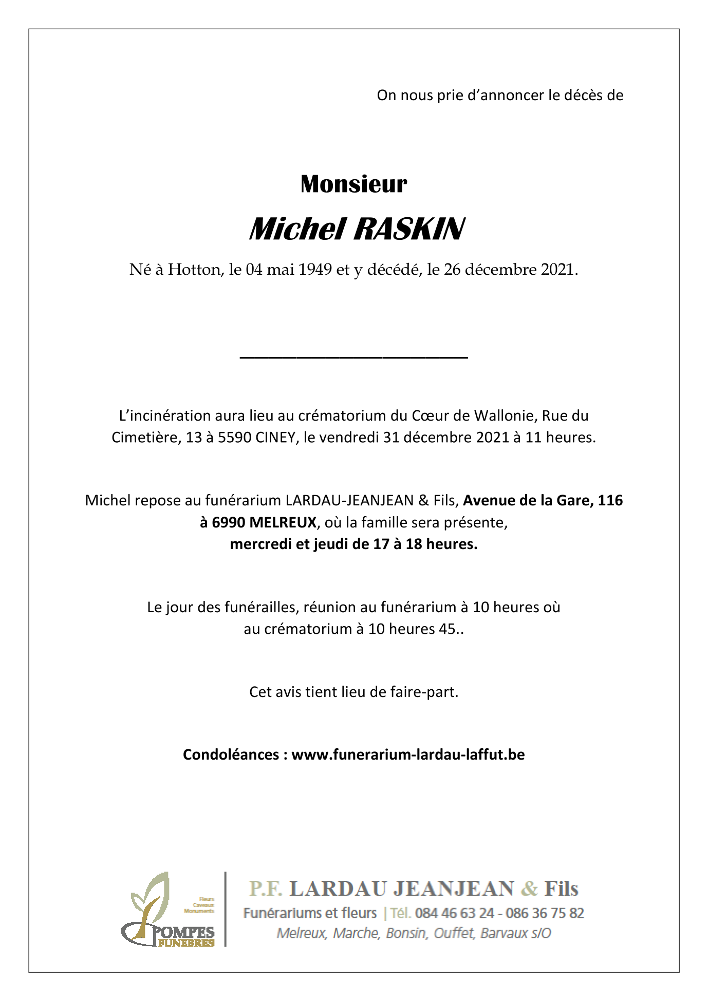 Décédé à Hotton (6990) le dimanche 26 décembre 2021 à l'âge de 72 ans