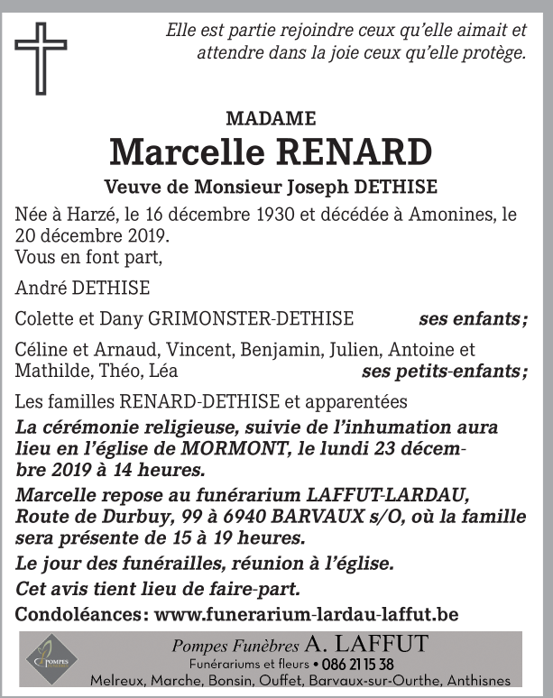 Décédée à Erezée (6997) le vendredi 20 décembre 2019 à l'âge de 89 ans