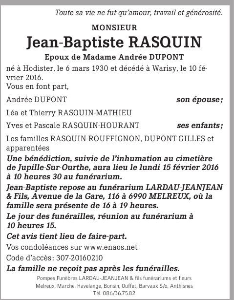 Décédé à Warisy (6987) le mercredi 10 février 2016 à l'âge de 85 ans