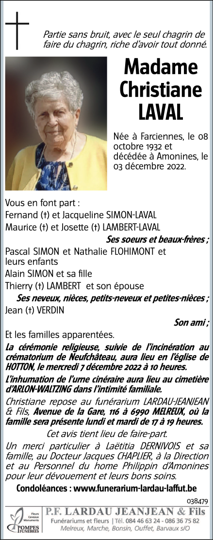 Décédée à Amonines (6997) le samedi 3 décembre 2022 à l'âge de 90 ans