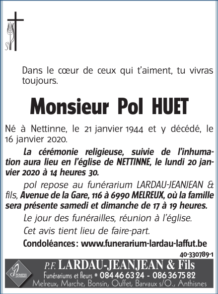 Décédé à Nettinne (5377) le jeudi 16 janvier 2020 à l'âge de 75 ans