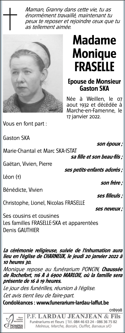 Décédée à Marche-en-Famenne (6900) le lundi 17 janvier 2022 à l'âge de 89 ans