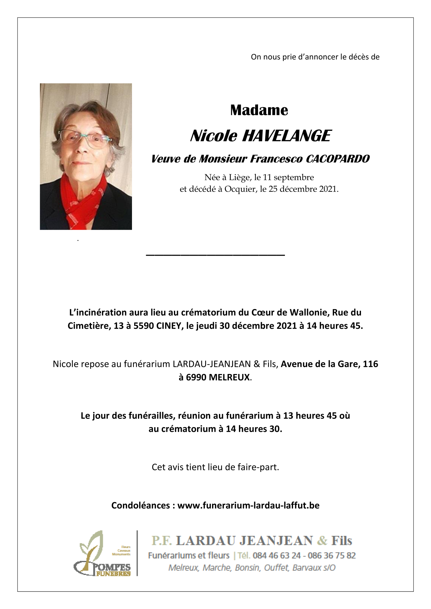Décédée à Ocquier (4560) le samedi 25 décembre 2021 à l'âge de 87 ans