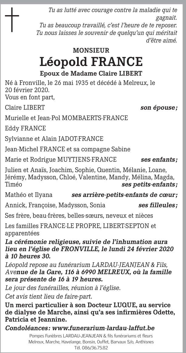 Décédé à Melreux (6990) le jeudi 20 février 2020 à l'âge de 84 ans