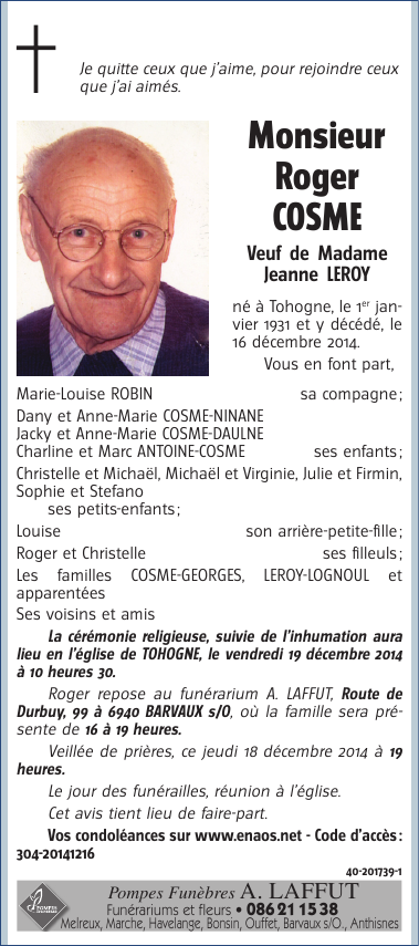 Décédé à Tohogne (6941) le mardi 16 décembre 2014 à l'âge de 83 ans