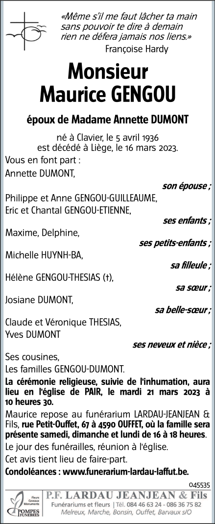 Décédé à Liège (4000) le jeudi 16 mars 2023 à l'âge de 86 ans