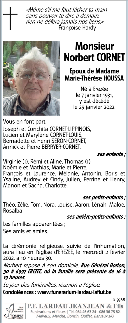Décédé à Erezée (6997) le samedi 29 janvier 2022 à l'âge de 91 ans