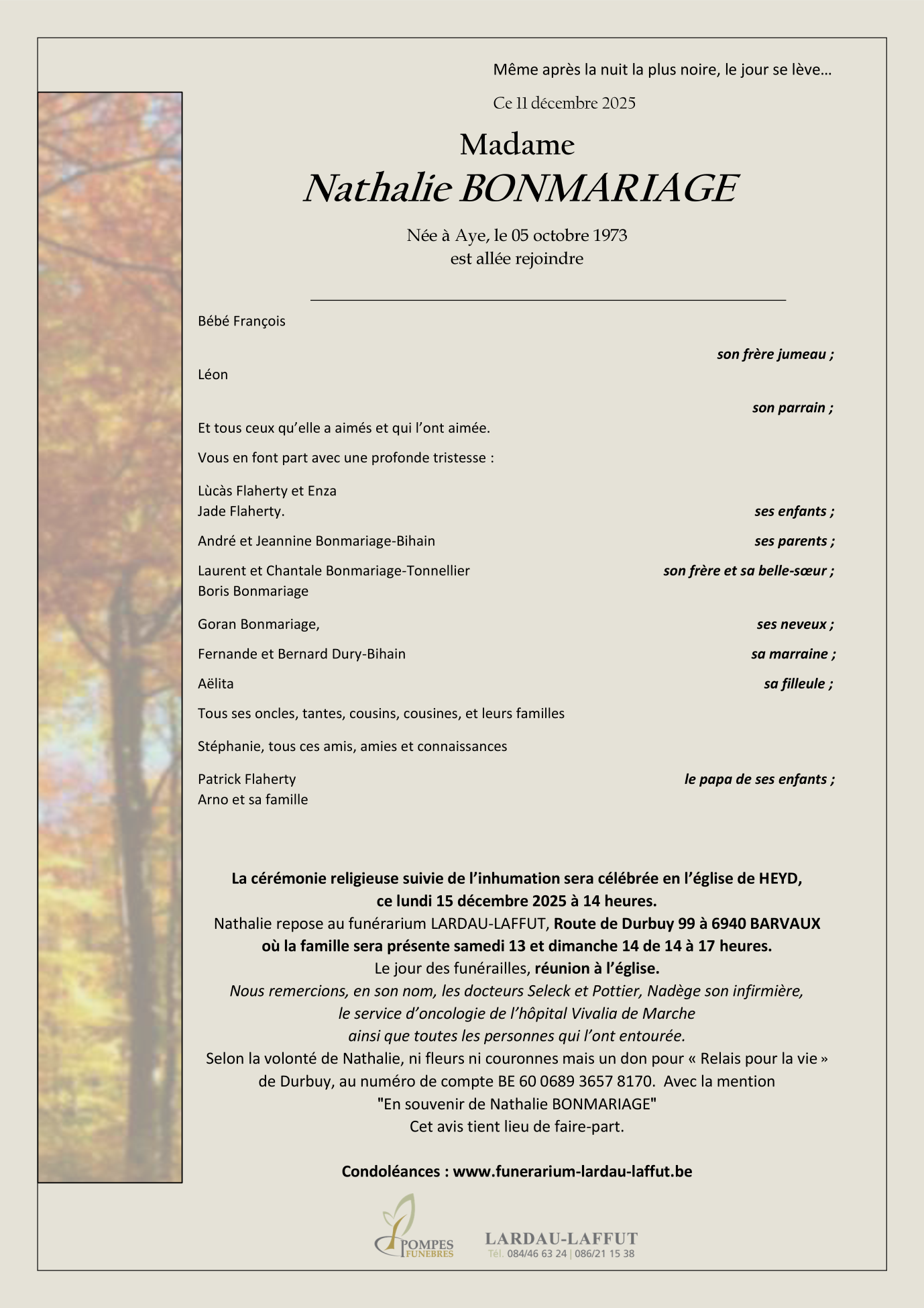 Décédée à Marche-en-Famenne (6900) le jeudi 11 décembre 2025 à l'âge de 52 ans