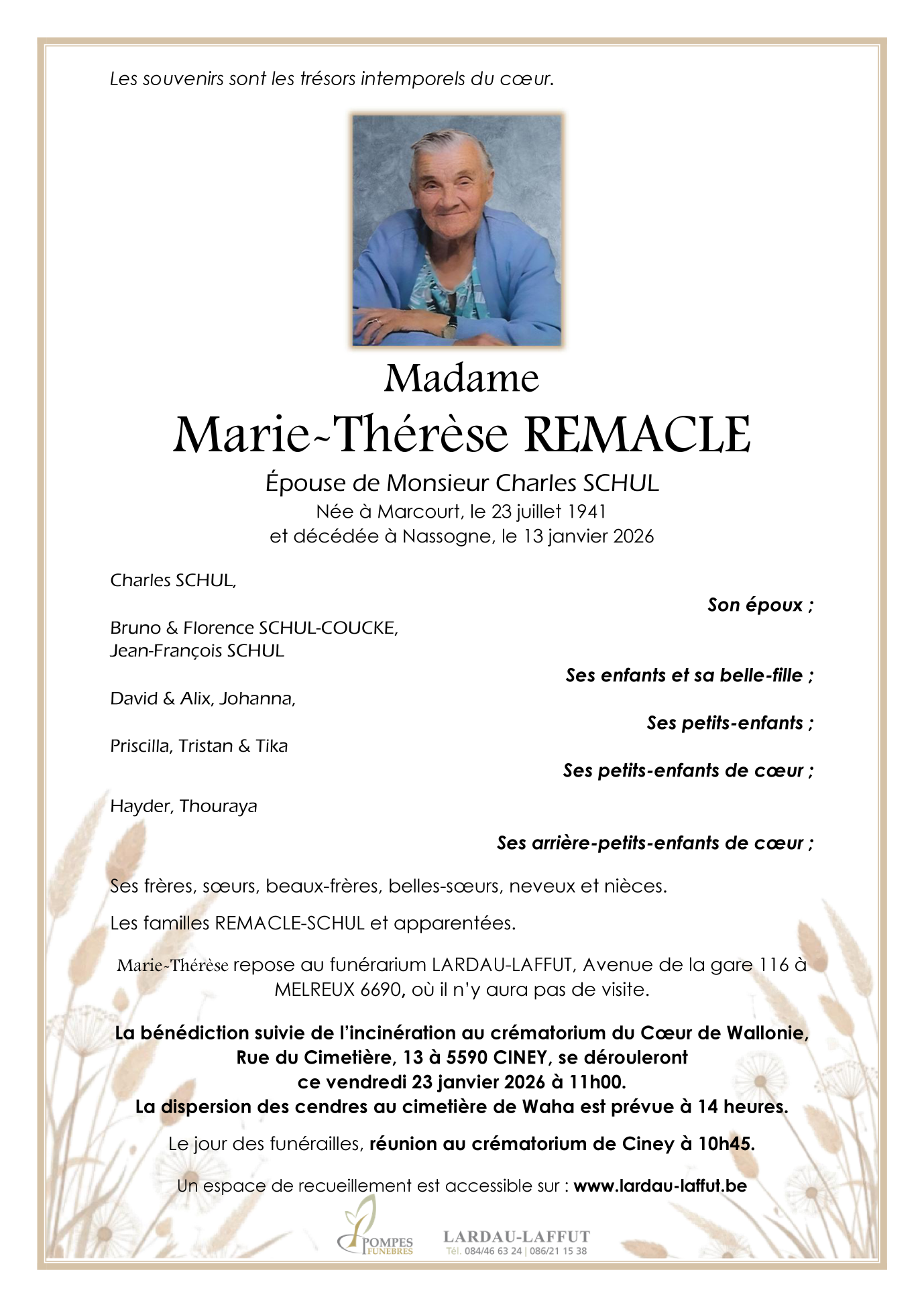 Décédée à Nassogne (6950) le mardi 13 janvier 2026 à l'âge de 84 ans
