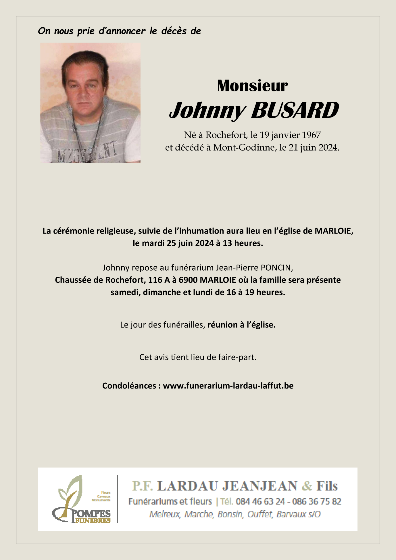 Décédé à Yvoir (5530) le vendredi 21 juin 2024 à l'âge de 57 ans