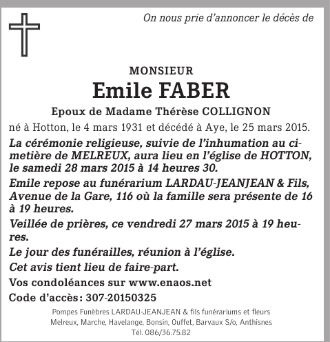 Décédé à Aye (6900) le mercredi 25 mars 2015 à l'âge de 84 ans