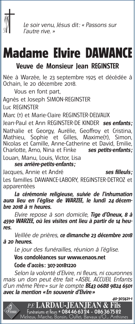 Décédée à Clavier (4560) le jeudi 20 décembre 2018 à l'âge de 93 ans