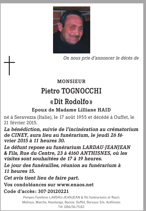 Décédé à Ouffet (4590) le samedi 21 février 2015 à l'âge de 59 ans