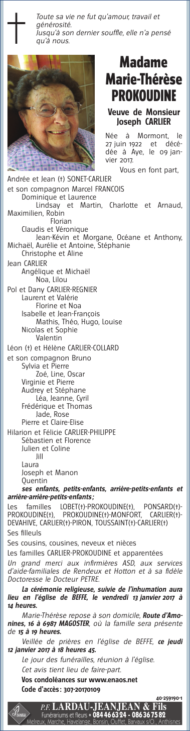 Décédée à Aye (6900) le lundi 9 janvier 2017 à l'âge de 94 ans