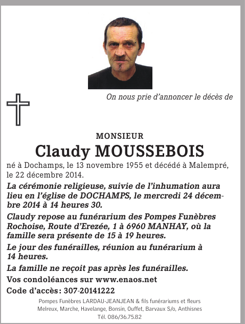 Décédé à Malempré (6960) le lundi 22 décembre 2014 à l'âge de 59 ans