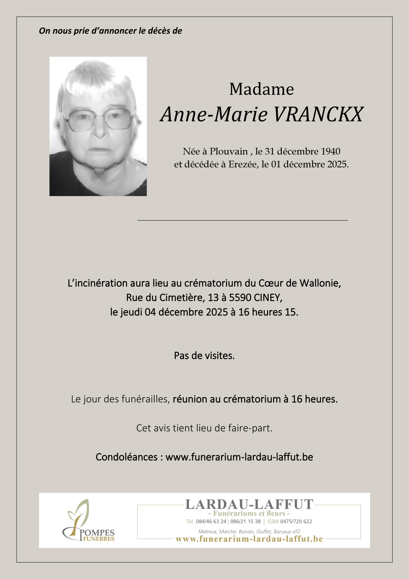 Décédée à Erezée (6997) le lundi 1 décembre 2025 à l'âge de 84 ans