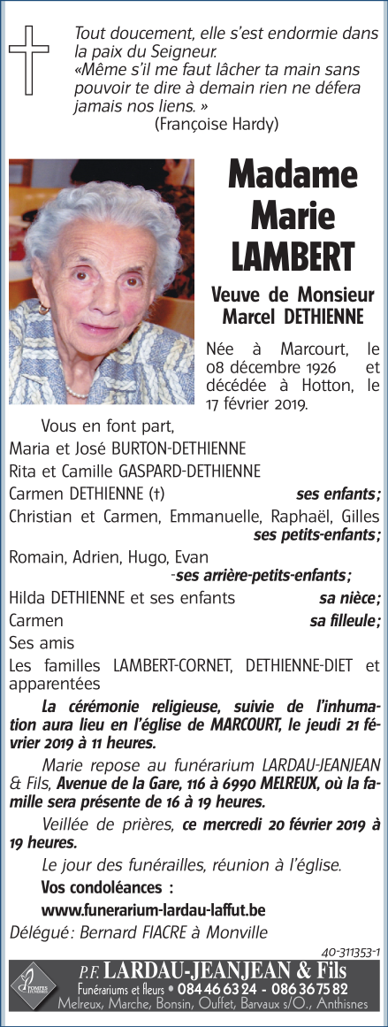 Décédée à Hotton (6990) le dimanche 17 février 2019 à l'âge de 92 ans