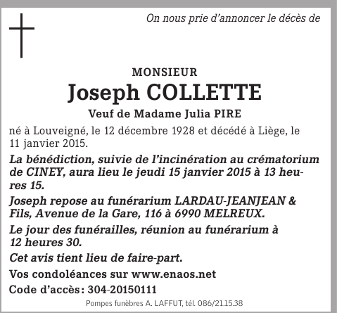 Décédé à Liège (4000) le dimanche 11 janvier 2015 à l'âge de 86 ans