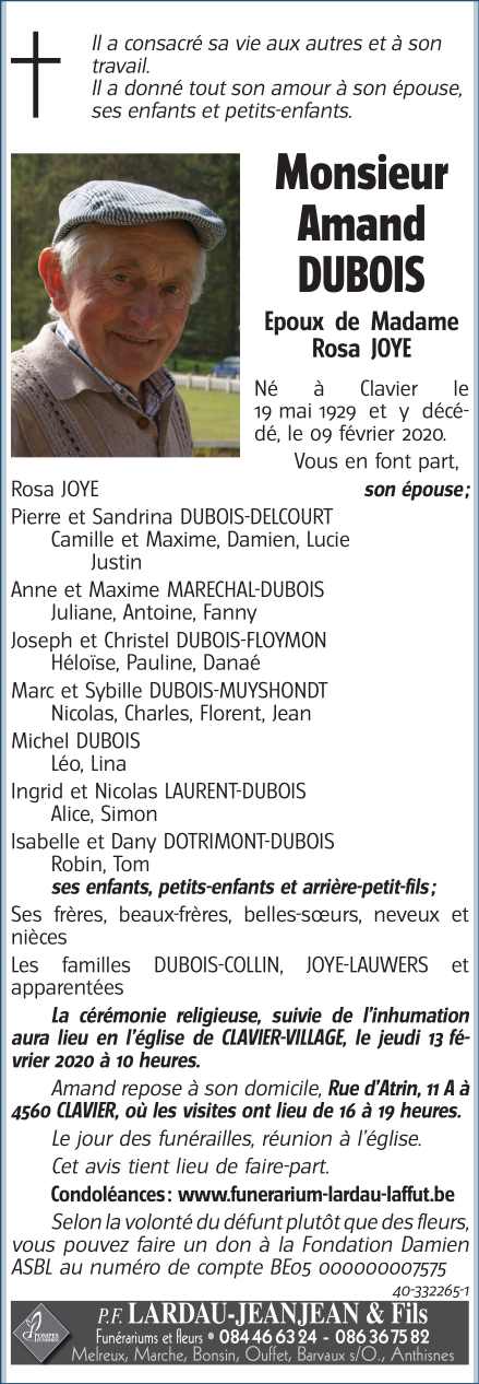 Décédé à Clavier (4560) le dimanche 9 février 2020 à l'âge de 90 ans