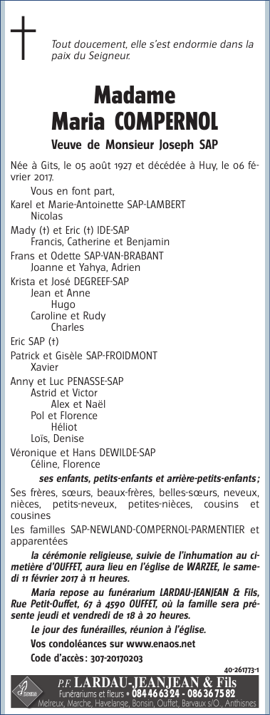 Décédée à Huy (4500) le lundi 6 février 2017 à l'âge de 89 ans