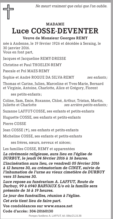 Décédé à Seraing (4100) le samedi 30 janvier 2016 à l'âge de 89 ans
