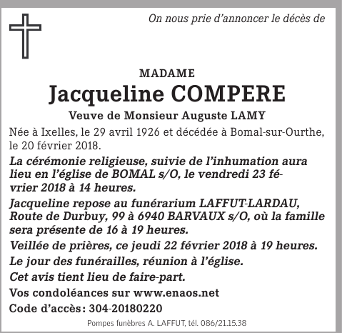 Décédée à Bomal-sur-Ourthe (6941) le mardi 20 février 2018 à l'âge de 91 ans