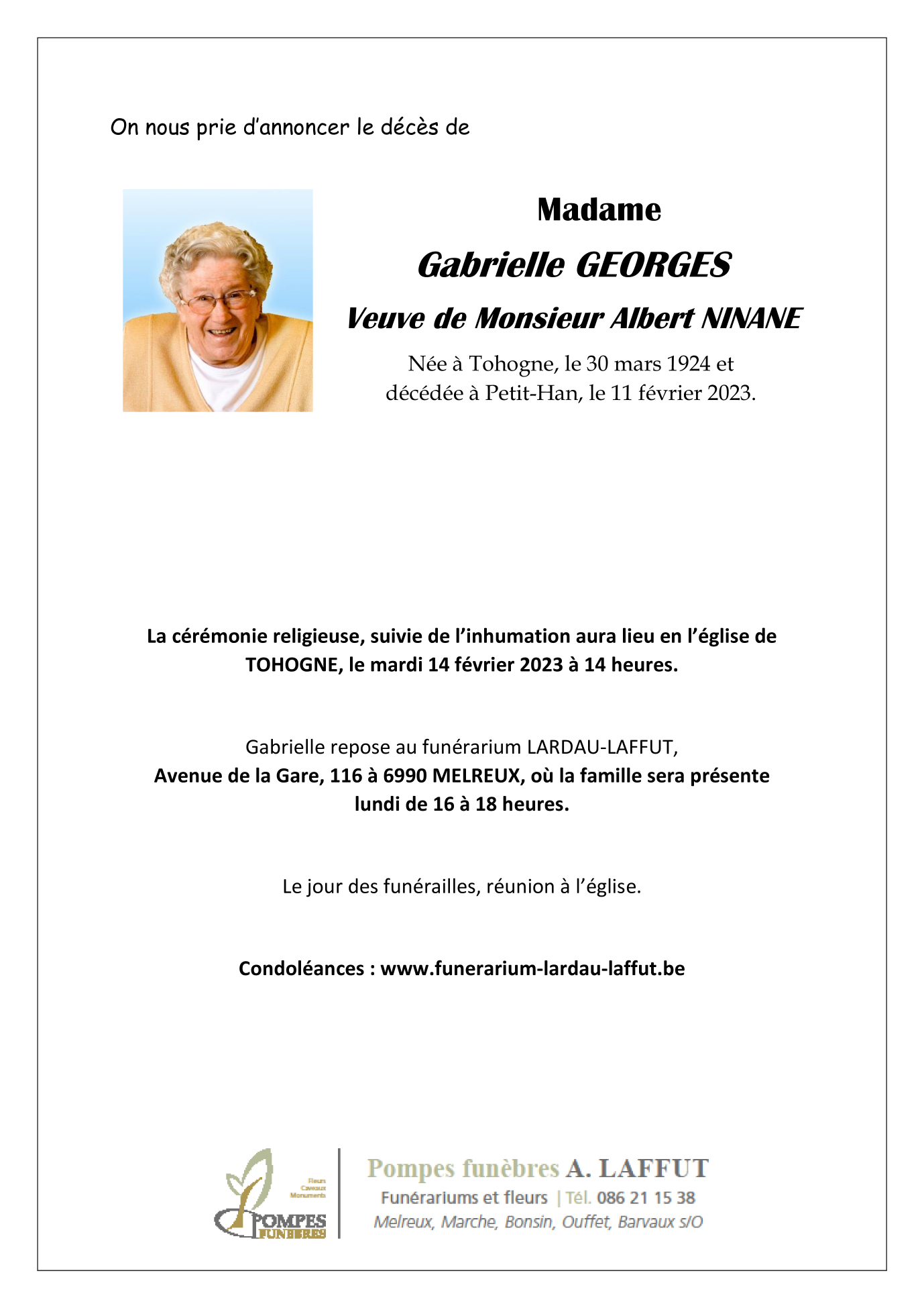 Décédée à Petit-Han (6940) le samedi 11 février 2023 à l'âge de 98 ans