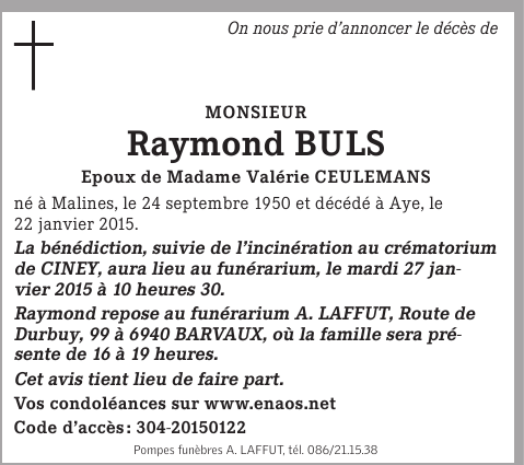 Décédé à Aye (6900) le jeudi 22 janvier 2015 à l'âge de 64 ans