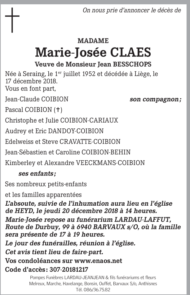 Décédée à Liège (4000) le lundi 17 décembre 2018 à l'âge de 66 ans