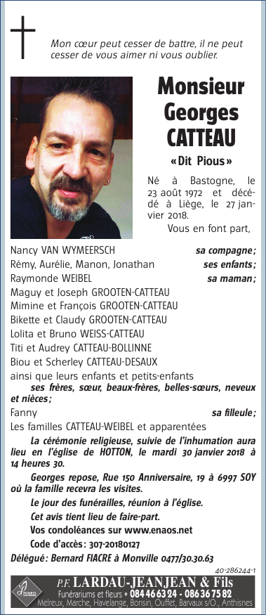 Décédé à Liège (4000) le samedi 27 janvier 2018 à l'âge de 45 ans