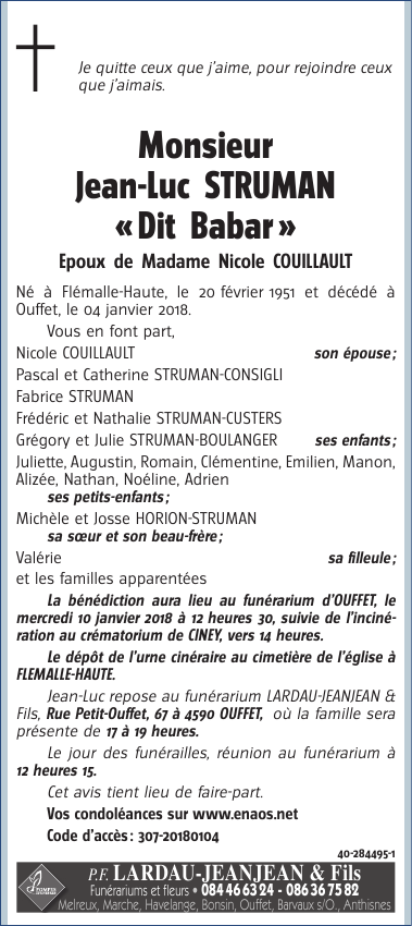 Décédé à Ouffet (4590) le jeudi 4 janvier 2018 à l'âge de 66 ans