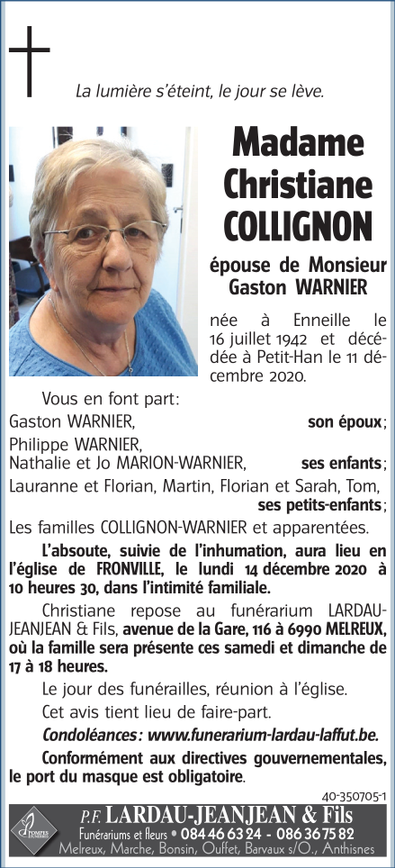 Décédée à Petit-Han (6940) le vendredi 11 décembre 2020 à l'âge de 78 ans