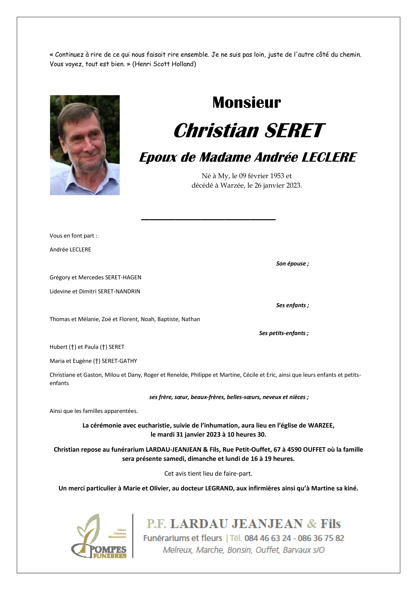 Décédé à Warzée (4590) le jeudi 26 janvier 2023 à l'âge de 69 ans