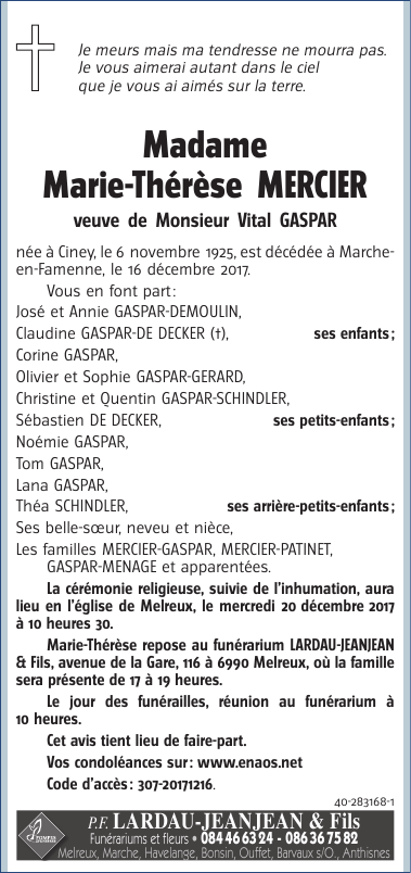Décédée à Marche-en-Famenne (6900) le samedi 16 décembre 2017 à l'âge de 92 ans