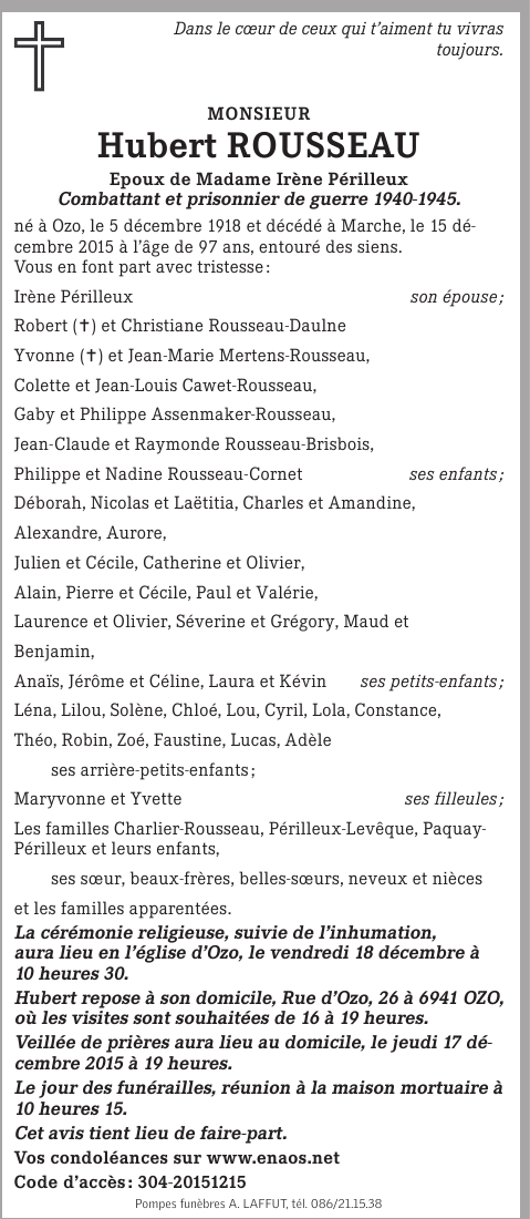 Décédé à Aye (6900) le mardi 15 décembre 2015 à l'âge de 97 ans