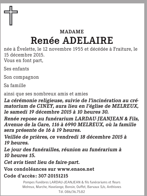 Décédée à Fraiture (4557) le mardi 15 décembre 2015 à l'âge de 60 ans