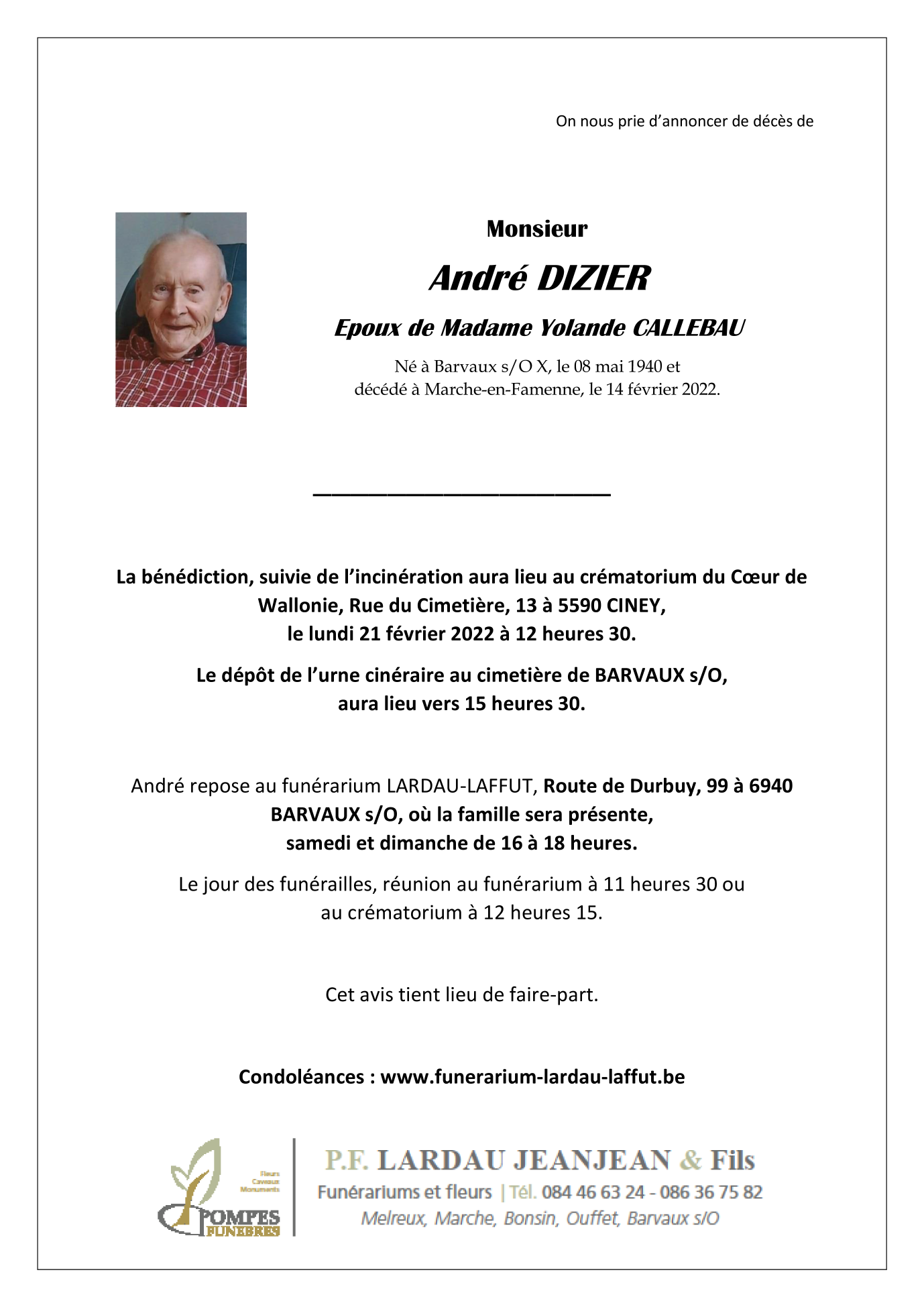 Décédé à Marche-en-Famenne (6900) le lundi 14 février 2022 à l'âge de 82 ans