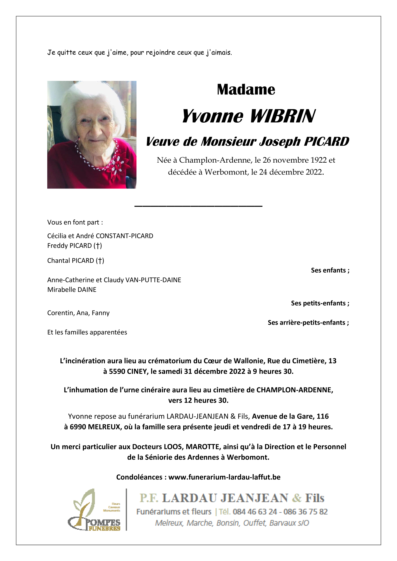 Décédée à Werbomont (4190) le samedi 24 décembre 2022 à l'âge de 100 ans