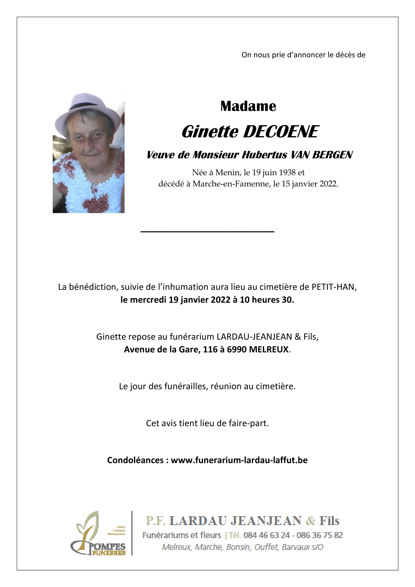 Décédée à Marche-en-Famenne (6900) le samedi 15 janvier 2022 à l'âge de 83 ans