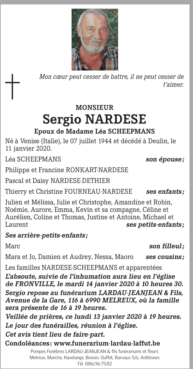 Décédé à Deulin (6990) le samedi 11 janvier 2020 à l'âge de 75 ans