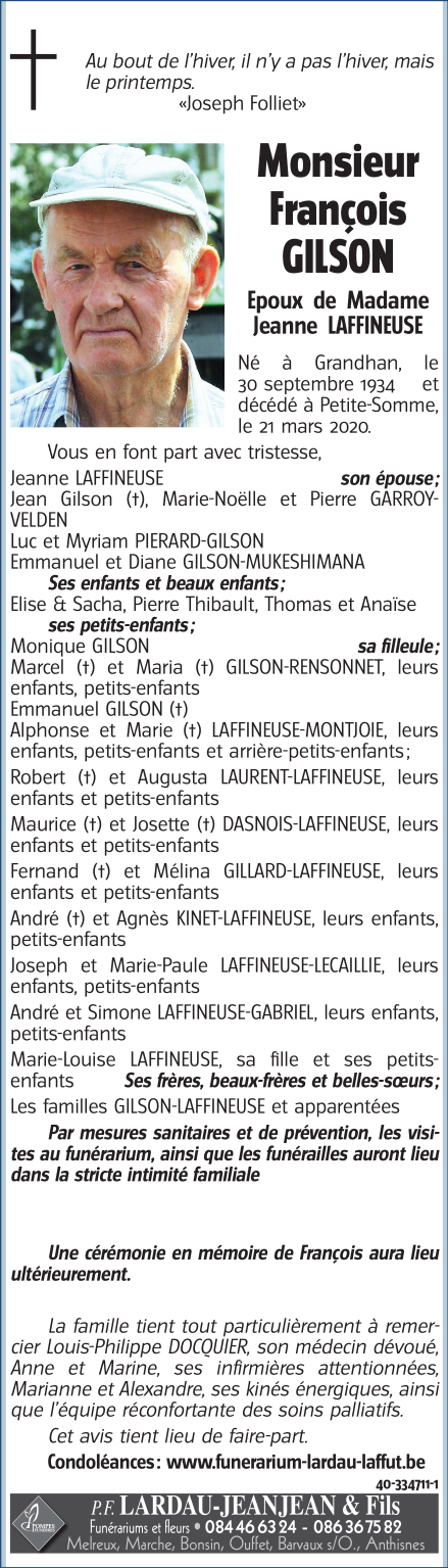 Décédé à Petite-Somme (6940) le samedi 21 mars 2020 à l'âge de 85 ans
