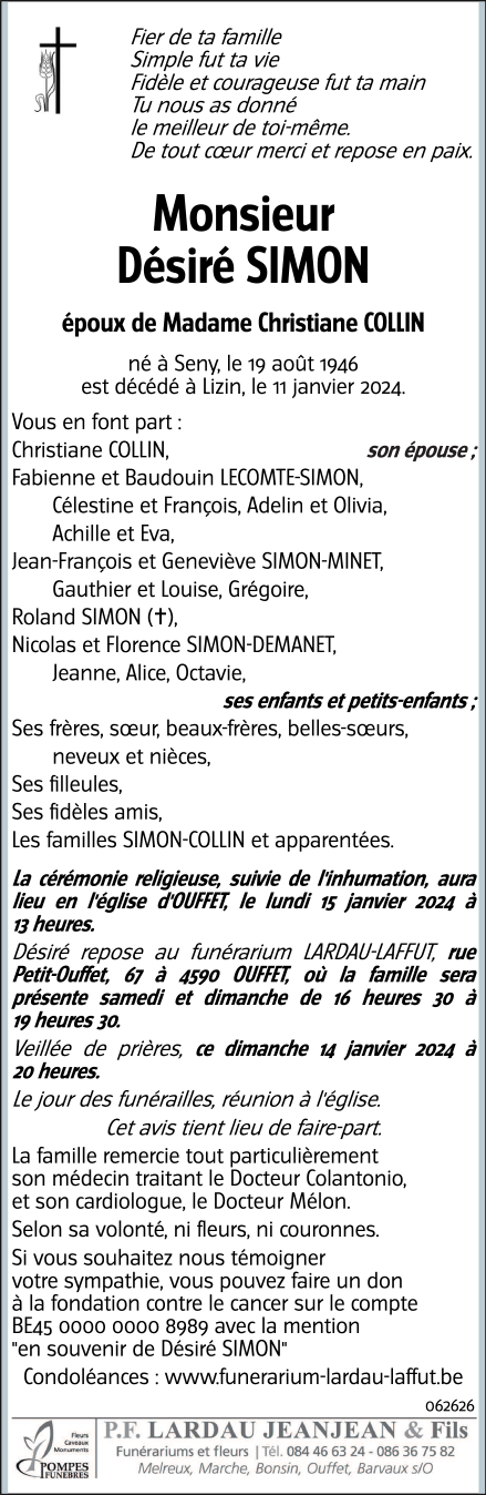 Décédé à Ouffet (4590) le jeudi 11 janvier 2024 à l'âge de 77 ans