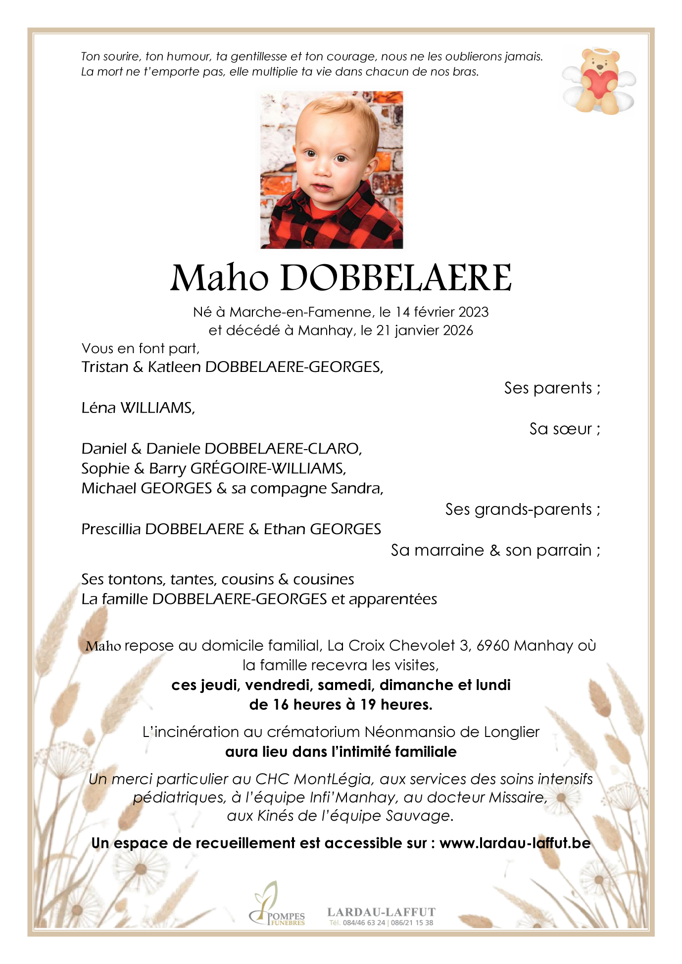 Décédée à Manhay (6960) le mercredi 21 janvier 2026 à l'âge de 2 ans