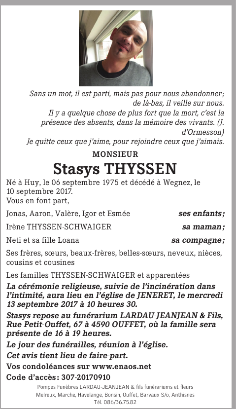 Décédé à Wegnez (4860) le dimanche 10 septembre 2017 à l'âge de 42 ans