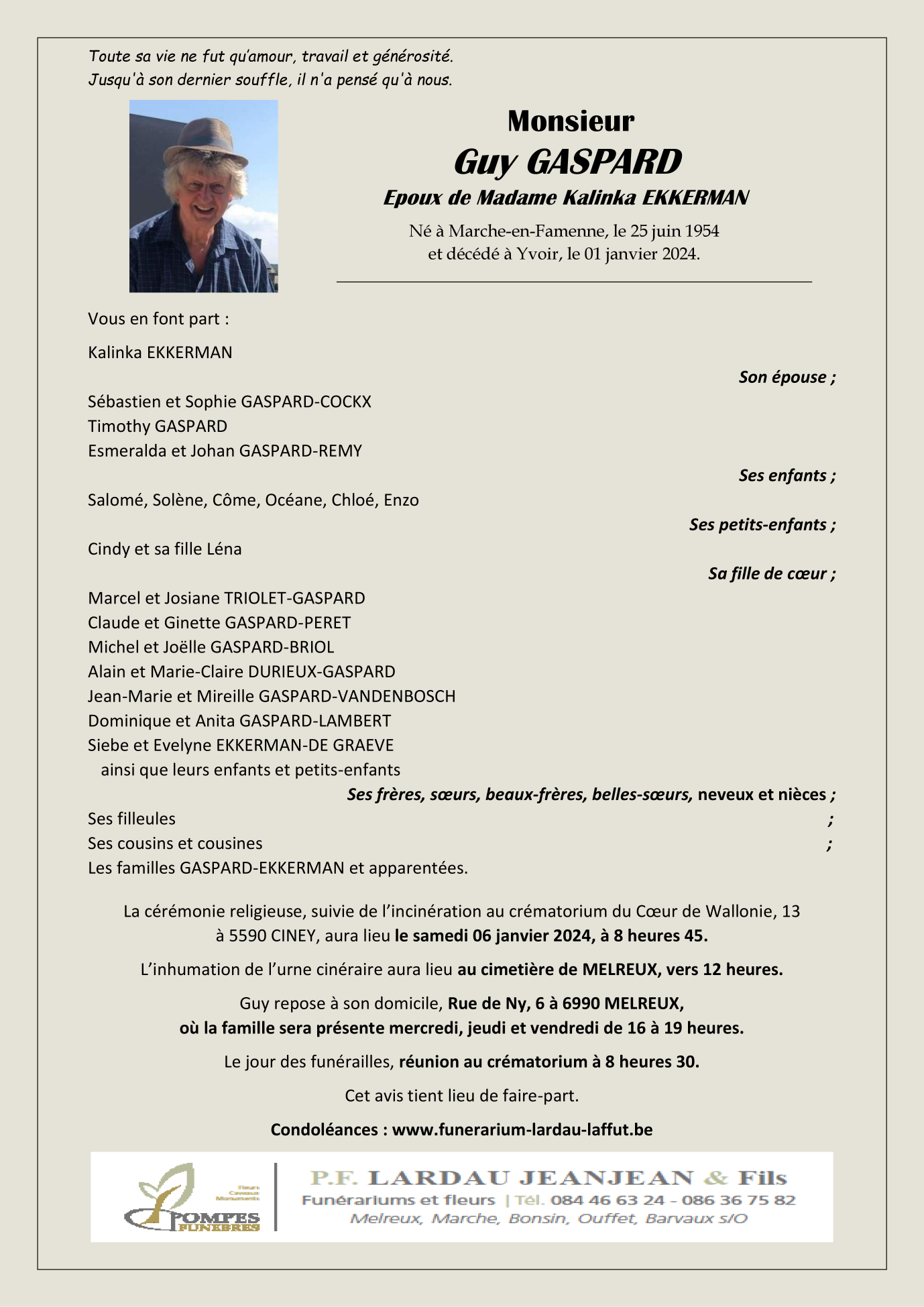 Décédé à Yvoir (5530) le lundi 1 janvier 2024 à l'âge de 69 ans