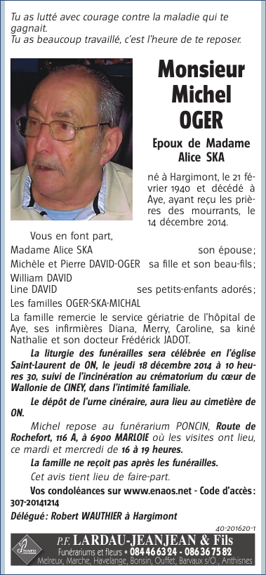 Décédé à Aye (6900) le dimanche 14 décembre 2014 à l'âge de 74 ans