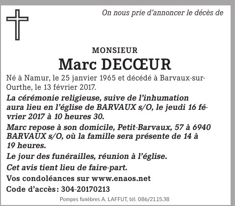 Décédé à Barvaux-sur-Ourthe (6940) le lundi 13 février 2017 à l'âge de 52 ans