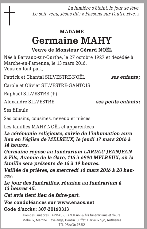 Décédé à Marche-en-Famenne (6900) le dimanche 13 mars 2016 à l'âge de 88 ans